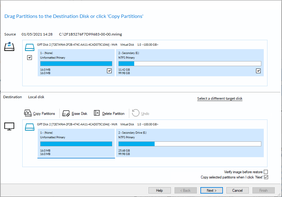 要恢复分区,请选择复制分区,然后选择精确分区偏移量和长度以将分区恢复到目标磁盘上的相同位置,或选择收缩或扩展以填充目标磁盘以自动调整分区大小以适合目标。也可以选择不同的目标磁盘并将分区拖到不同的位置,然后手动调整它们的大小以使用可用空间。只需将源分区拖到目标磁盘上的任何可用分区或可用空间即可。您还可以删除目标磁盘上的分区以腾出空间。有关更多目标选项和更多信息,请参阅 修改已恢复的分区属性。